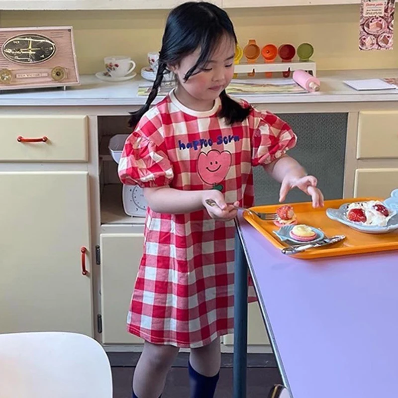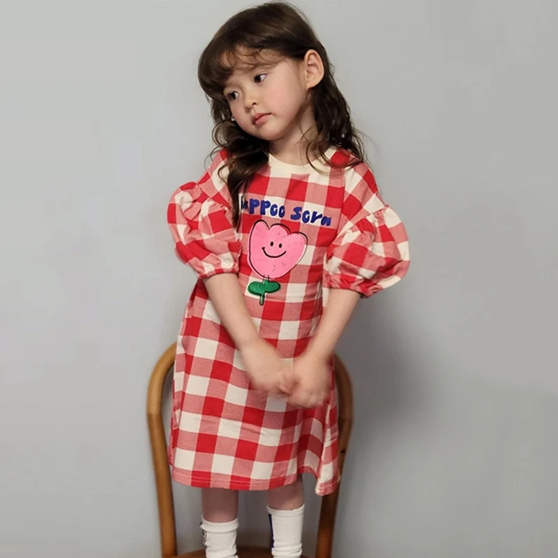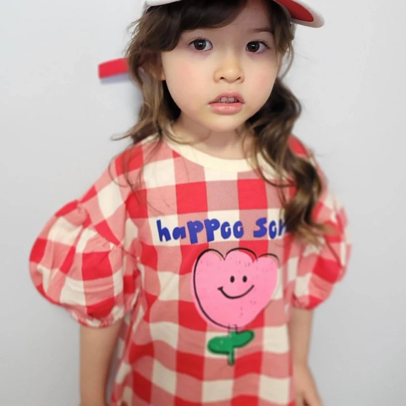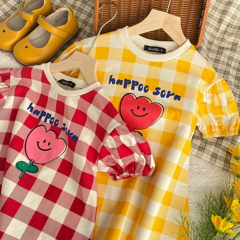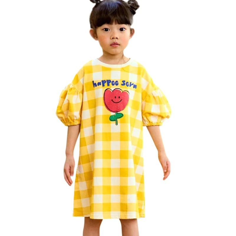 فستان فتاة الصيفي ، ملابس أطفال عصرية فاتحة مريحة للبنات بتصميم جذاب بنقوش زهور الحب اللطيفة والمربعات، وياقة دائرية بأكمام قصيرة.