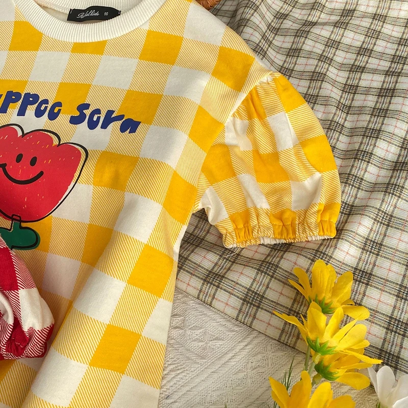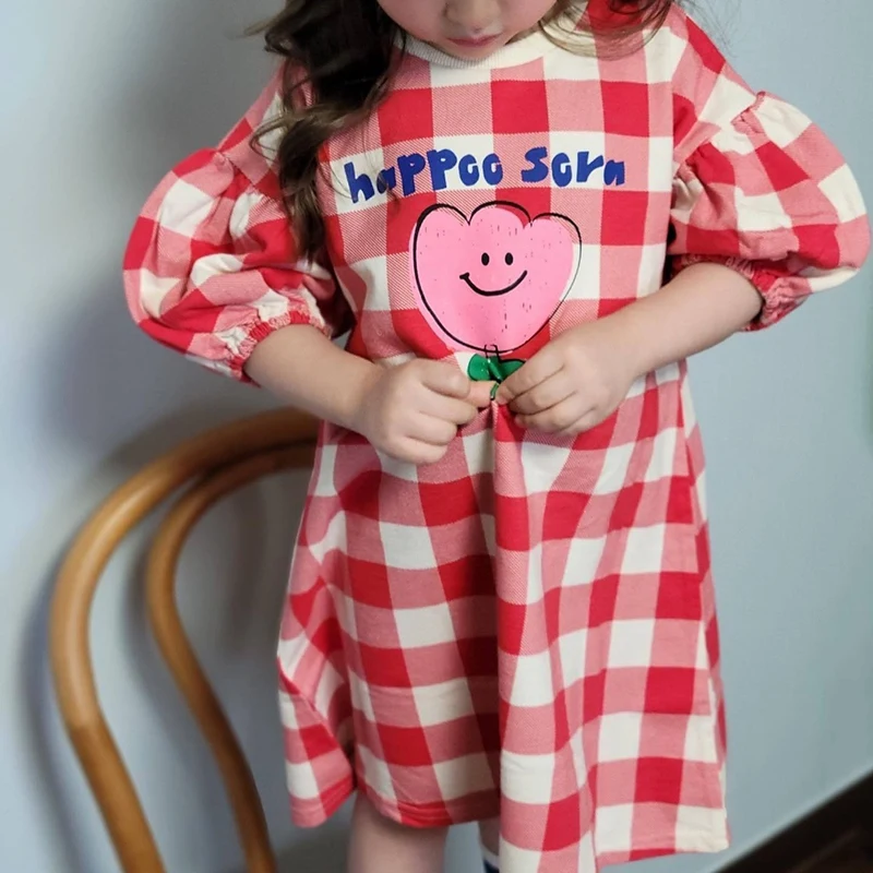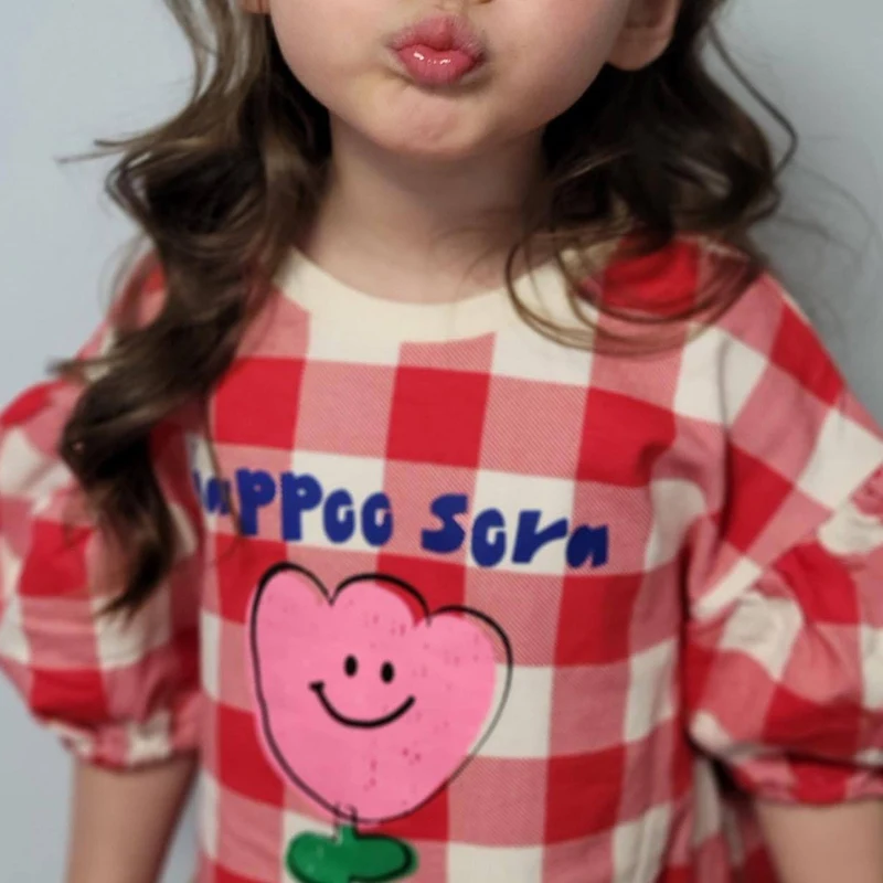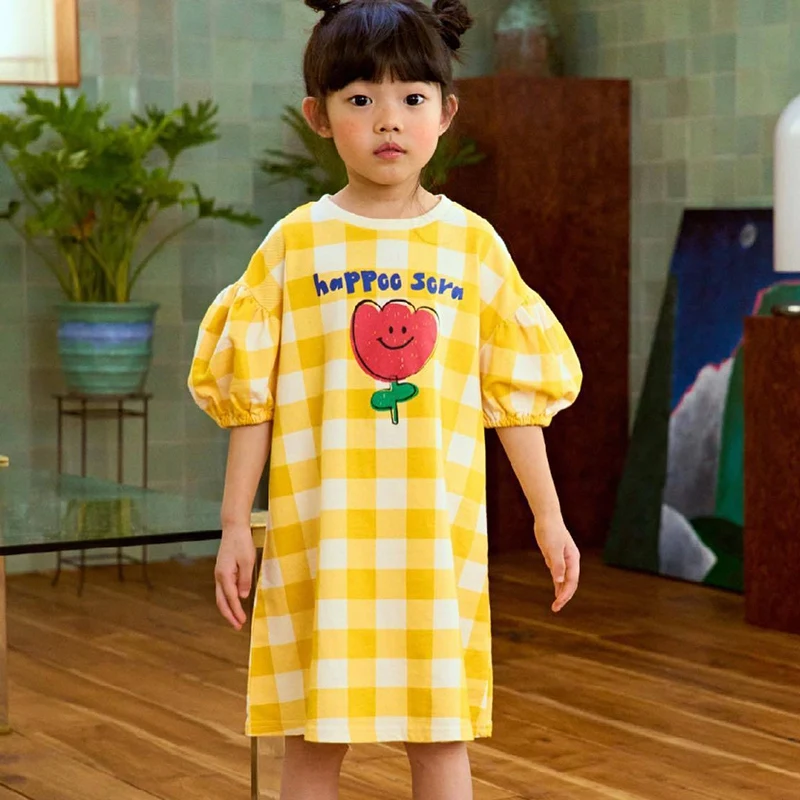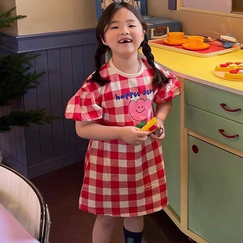 فستان فتاة الصيفي ، ملابس أطفال عصرية فاتحة مريحة للبنات بتصميم جذاب بنقوش زهور الحب اللطيفة والمربعات، وياقة دائرية بأكمام قصيرة.