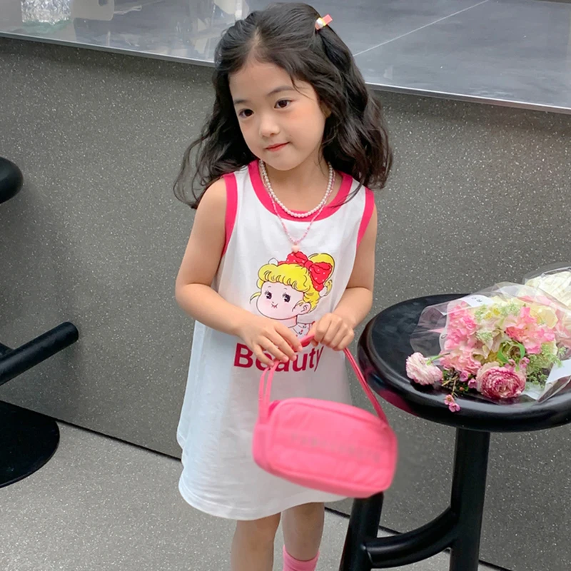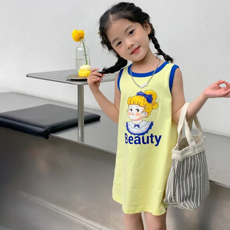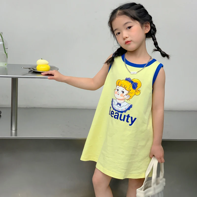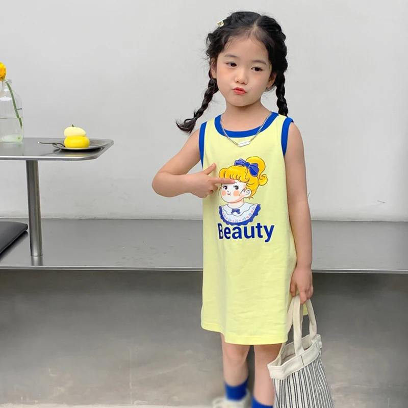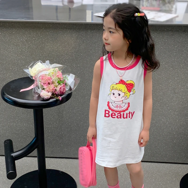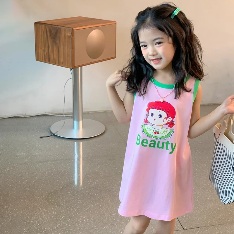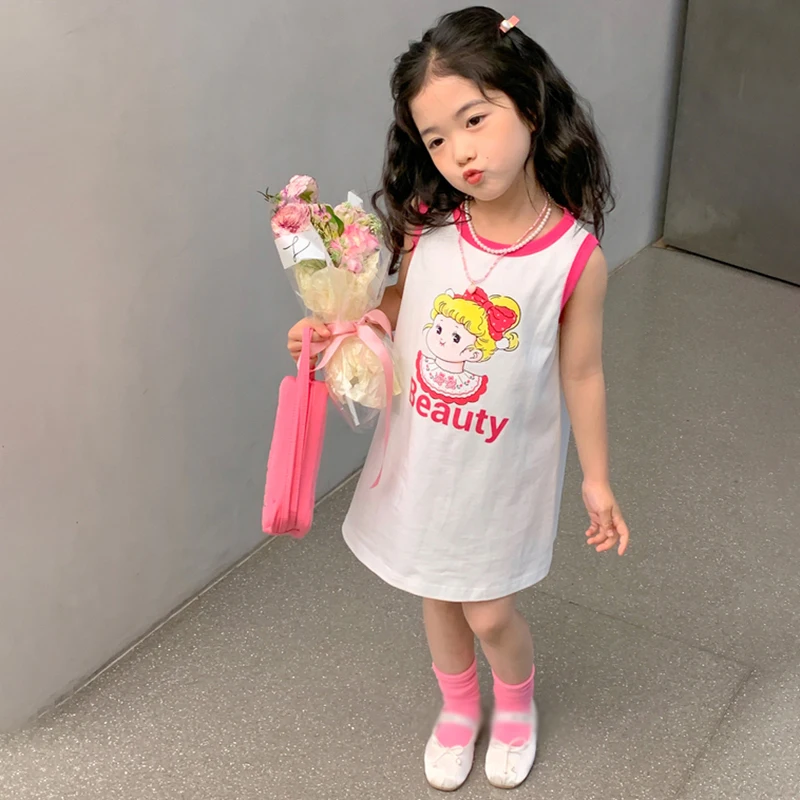 2. **التصميم:** فستان بدون أكمام بياقة دائرية وطباعة كرتونية، يجعل الفتيات أكثر جاذبية ويجذب الكثير من الإعجاب.