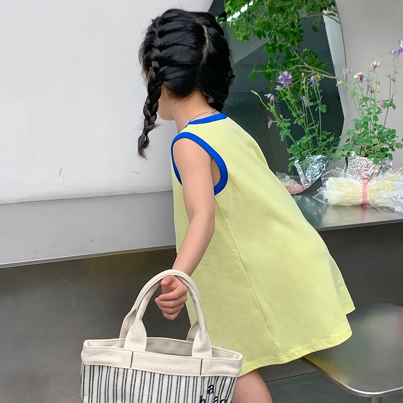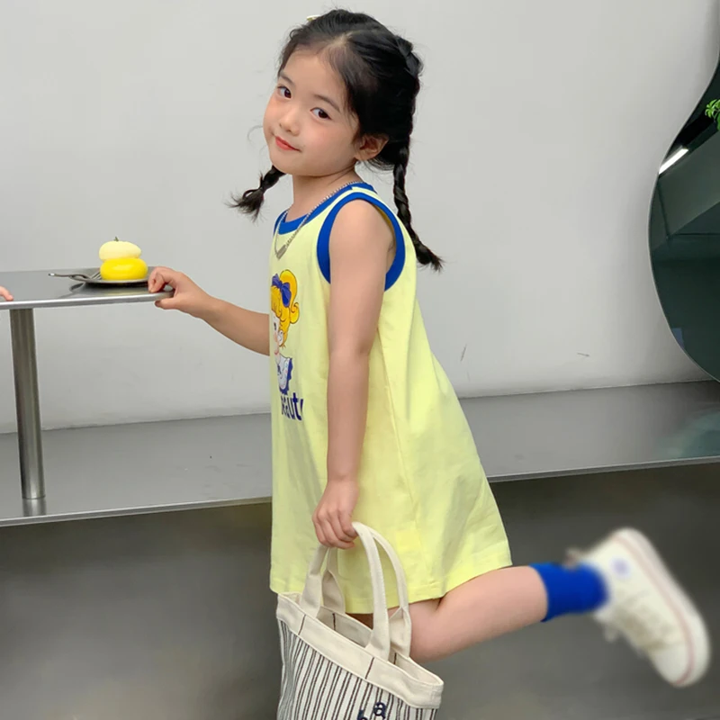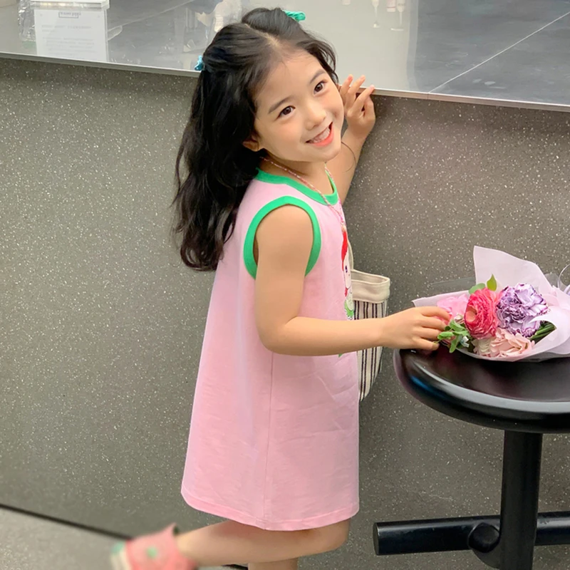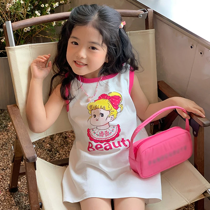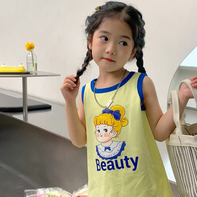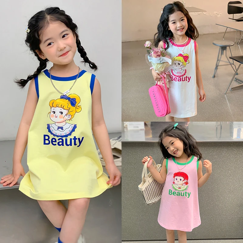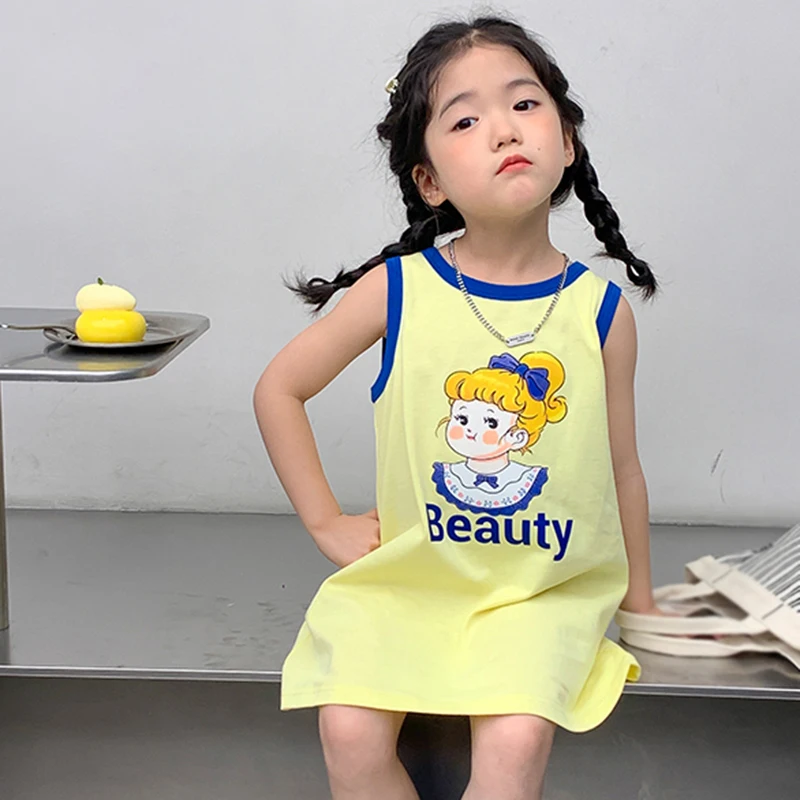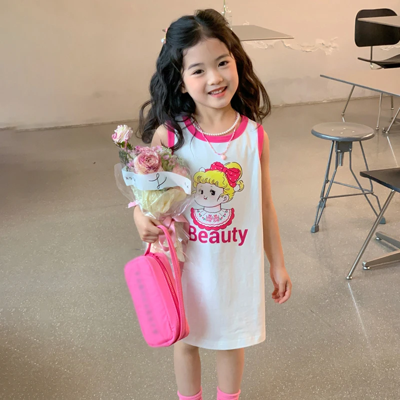 2. **التصميم:** فستان بدون أكمام بياقة دائرية وطباعة كرتونية، يجعل الفتيات أكثر جاذبية ويجذب الكثير من الإعجاب.
